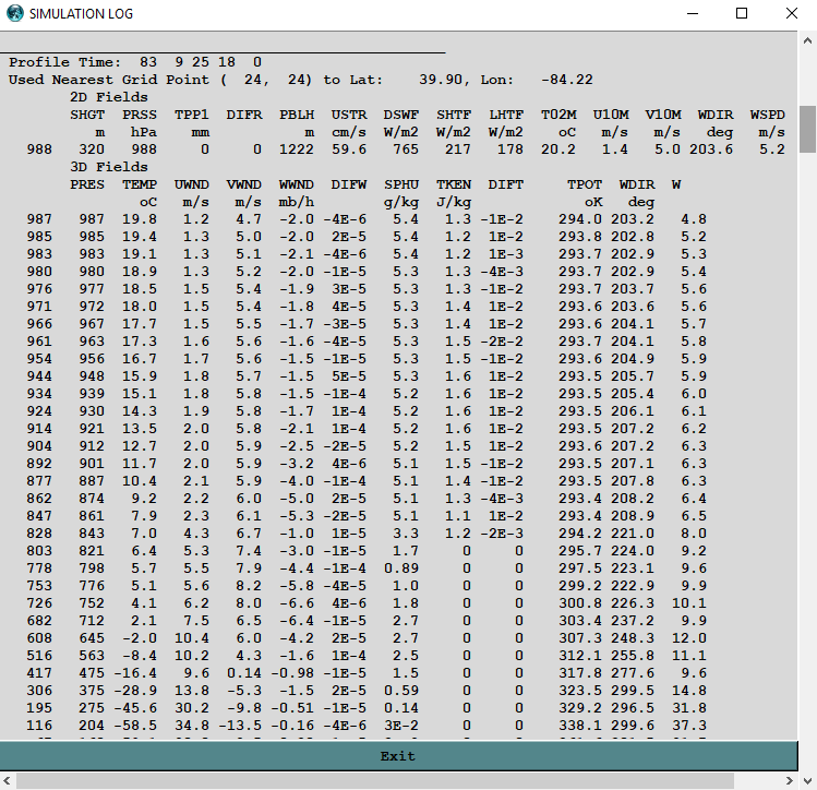 - The profile results will be shown in its own window and also written to the file profile.txt. In addition to the data contents at the selected grid point, the file also contains information about the first and last time periods. At this point all we need to know is the Height of the Planetary Boundary Layer (HPBL) which is shown to be 1222 meters (AGL). Information about each of the variables will be discussed later as needed. More information about these variables can be found in the Users Guide (see hysplit documents directory).