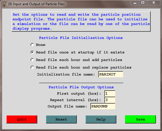 - Open menu #9, the input and output of particle files and change the first output time from 0 to 1 hour and repeat interval from 0 to 3 so that the particle output time will be at the same time as the concentration grid output times. The PARDUMP output file will be used for display purposes in the next section.