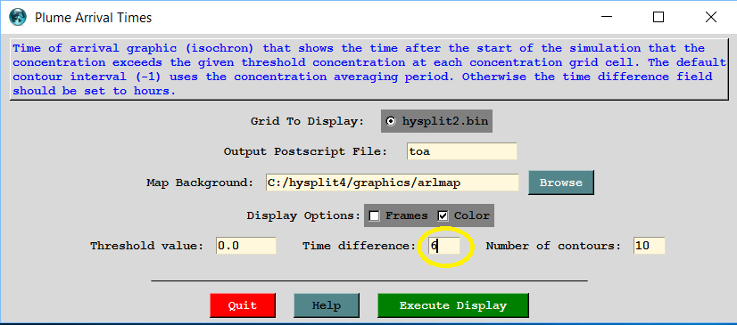 - To examine the temporal evolution of the released tracer, press the Concentration / Display / Arrival menu button to open the plume arrival time menu which will create a color-filled graphic representing the time after sampling has started that a grid cell shows a non-zero concentration. The menu permits setting a threshold concentration other than zero, as well as setting the number of contours and the time difference between contours. For this example, change the time difference from -1 (auto select) to 6 hours. The resulting output file toa.ps shows arrival times to the east coast of 42 hours. Only files with multiple time period output can be analyzed for arrival times.