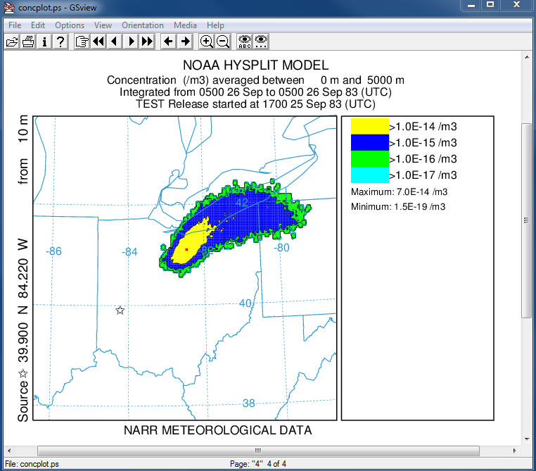 - Now Run Model, open the contour display menu and when complete, view each of the four frames (at 20Z, 23Z, 02Z, and 05Z). Note at the initial time, all the particles are close together and the pattern is continuous, but as the particles spread out due to turbulence and vertical wind shear, the results quickly degrade and by the last frame it almost appears that each of the 100 particles are individually visible. Also take note of the maximum concentration.