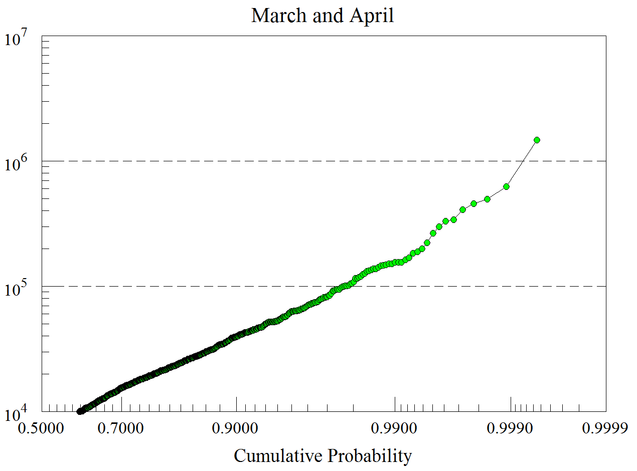 - The emission files for the continental U.S are based upon monthly averages over a five year period. Extracting all the emission factors for March and April and sorting them in ascending order, the cumulative distribution shows that we can expect a maximum value of 2.0E+06 g/m. Assume this represents the largest possible rate over the U.S. and then we set this value to each emission point in the Sevier Lake region. Each KA (dust density times emission area) value in the previous CONTROL file is replaced with the maximum value. This modified CONTROL_dust4.txt should be retrieved from the \Tutorial\dust directory. Save the changes and run the model.