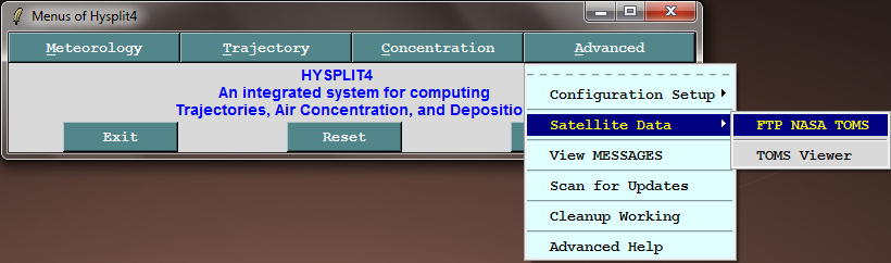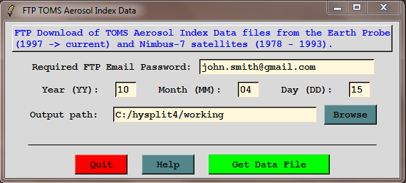 - Start by pressing the Advanced / Satellite Data / FTP NASA TOMS menu tab to open the download menu. Set your email address for the anonymous FTP password field and enter the download date to 10 04 15 and press Get Data File. A pop-up message will appear indicating the name of the file accessed. All files get renamed to a standard convention. This particular file will be renamed to ga100415.txt. In the event the FTP fails, copy the file from \Tutorial\volcano to the \Hysplit4\working directory.