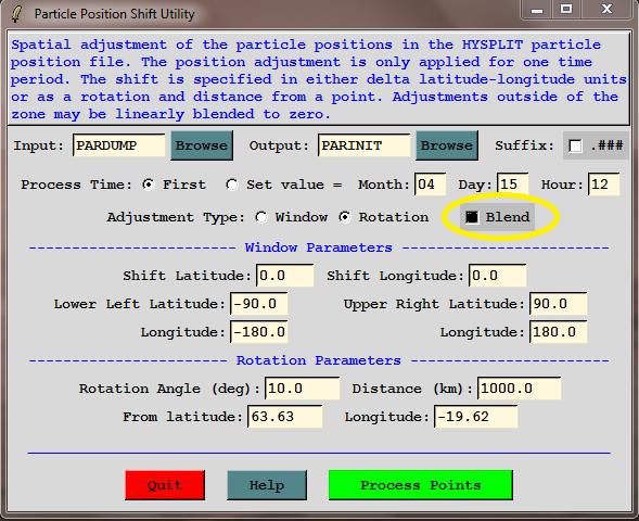- There are two adjustment options, defining a window and translating particles, or rotating them about a point. We will choose the rotation option. Select the rotation radio-button. The rotation point defaults to the source location and enter a rotation angle of 10 degrees (positive = clockwise) to a distance of 1000 km. All particles within this distance will be rotated. The menu already defaults to writing the adjusted particles to PARINIT which would then default to the input file for the next simulation cycle. Process the points and the script will automatically open the particle display where there is an obvious discontinuity at 1000 km. This could be eliminated by selecting the blend option.