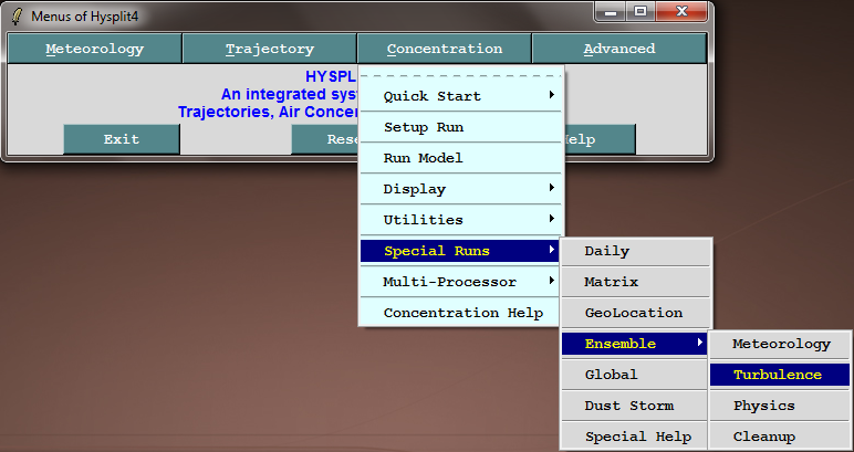 - After the Setup Run and the Advanced Configuration menus have been retrieved, open the Advanced / Configuration Setup / Concentration / Menu #4 and change the particle release per cycle from 10000 to 1852. Although the turbulence ensemble can be composed of any number of members, to parallel the meteorological grid ensemble, 27 variations are also run in this case. The 1852 is determined by dividing 50000 (from the original simulation) by the number of members to maintain about the same total particle number when computing the mean concentration.