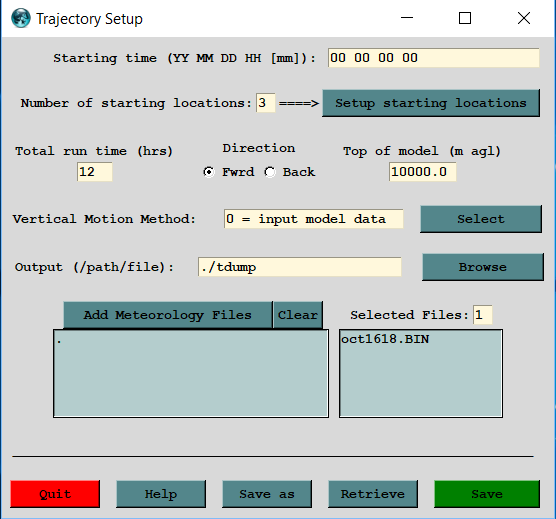 The display of the three-trajectory graphic means that all the HYSPLIT components have been correctly installed. In subsequent simulations through the GUI, the Quick Start menu would normally not be used because it automatically combines three individual steps: configuring the model simulation, running the simulation, and converting the output to a graphical format. These components will be explored in more detail individually. Many of the features available through the GUI apply to trajectory as well as air concentration calculations. After testing the air concentration simulation in the next section, the trajectory calculations will be explored in more detail. | ||||||||||||