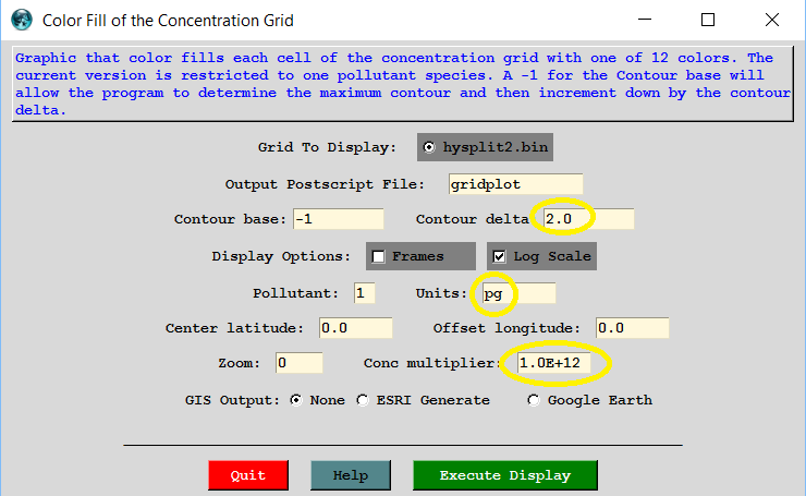 - Press the Concentration / Display / Concentration / Contours menu tab to open the concentration display menu. Only a few changes are required from the defaults. Because we defined the release rate in grams and we know that the measured concentration data are reported in pico-grams per cubic meter, we need to define a concentration multiplier of 1.0E+12, the number of pg in each gram. The air concentration label field should also be changed from blank to pg. If desired, increase the zoom to reduce the whitespace around the plot.