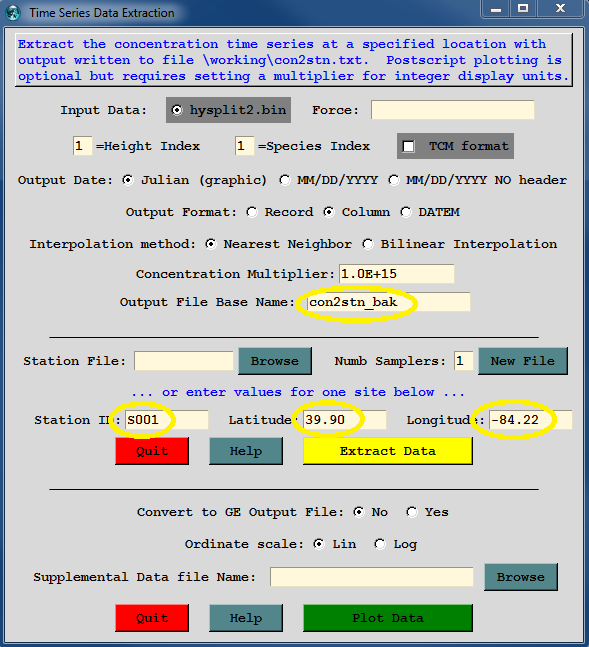 - When the run has completed, open the Utilities / Convert to Station menu and pick a site, such as S316, Oberlin OH, which we know is within the calculated and measured plume. Set the location to 41.30 -82.22. Also to keep enough significant digits in the fixed format output, increase the multiplier from 1.0E+12 to 1.0E+15. This last step is necessary because we reduced the emission rate from its actual value 67000.0 to a unit value. The resulting hourly output file at station 316 shows a value of 26.639 near the peak time (0700-0800) of the plume passage.