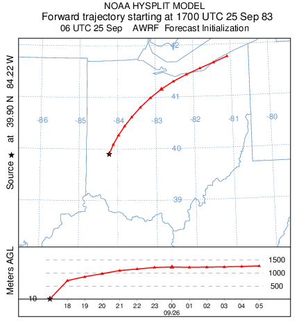 The particle display results clearly show why a single particle trajectory is insufficient to simulate the pollutant distribution. Particles that mixed to the upper-levels of the boundary layer travel at faster speeds. Winds aloft also tend to be more clockwise than those at the surface. Center-of-mass trajectories may be a suitable display alternative when the pollutant distribution remains continuous.