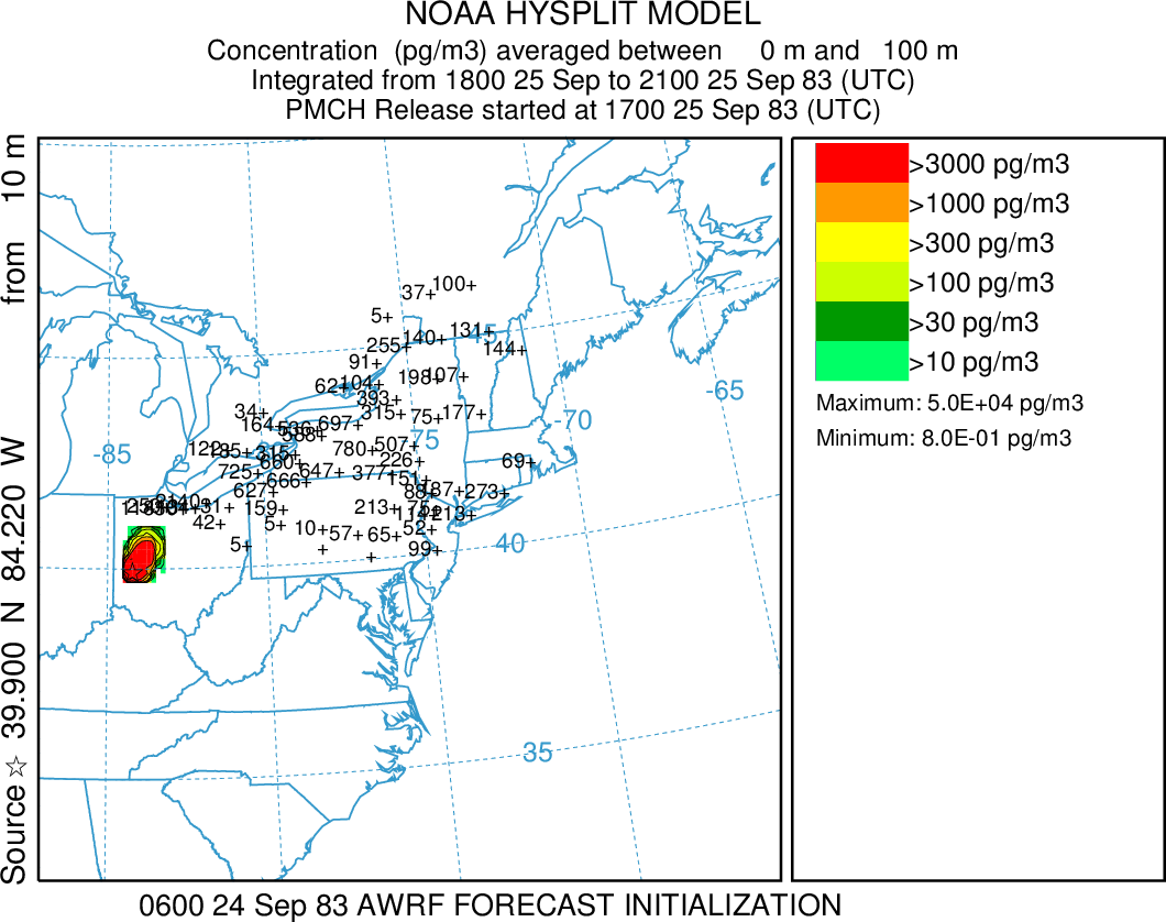 - Now explicitly set the start (83 09 25 18 00) and stop (83 09 28 15 00)times for the integration time on the concentration grid. Leaving the field as zeros starts the summation at the start of the run. But in this case we want the concentration grid times to match the actual times air samples were collected, which started at 18Z rather than the start of the release at 17Z.